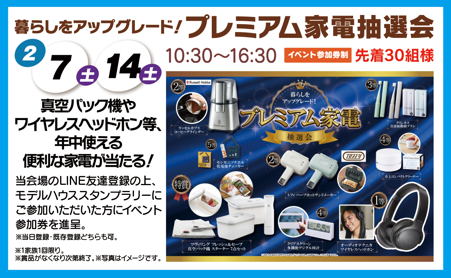 真空パック機やワイヤレスヘッドホン等、年中使える便利な家電が当たる! ●日程:2/7(土)・2/14(土)●時間:10:30~16:30●参加:イベント参加券制・先着30組様 当会場のLINE友達登録の上、モデルハウススタンプラリーにご参加いただいた方にイベント参加券を進呈。※当日登録・既存登録どちらも可。 ※1家族1回限り。※賞品がなくなり次第終了。※写真はイメージです。 見学予約|1回に3棟まで可能