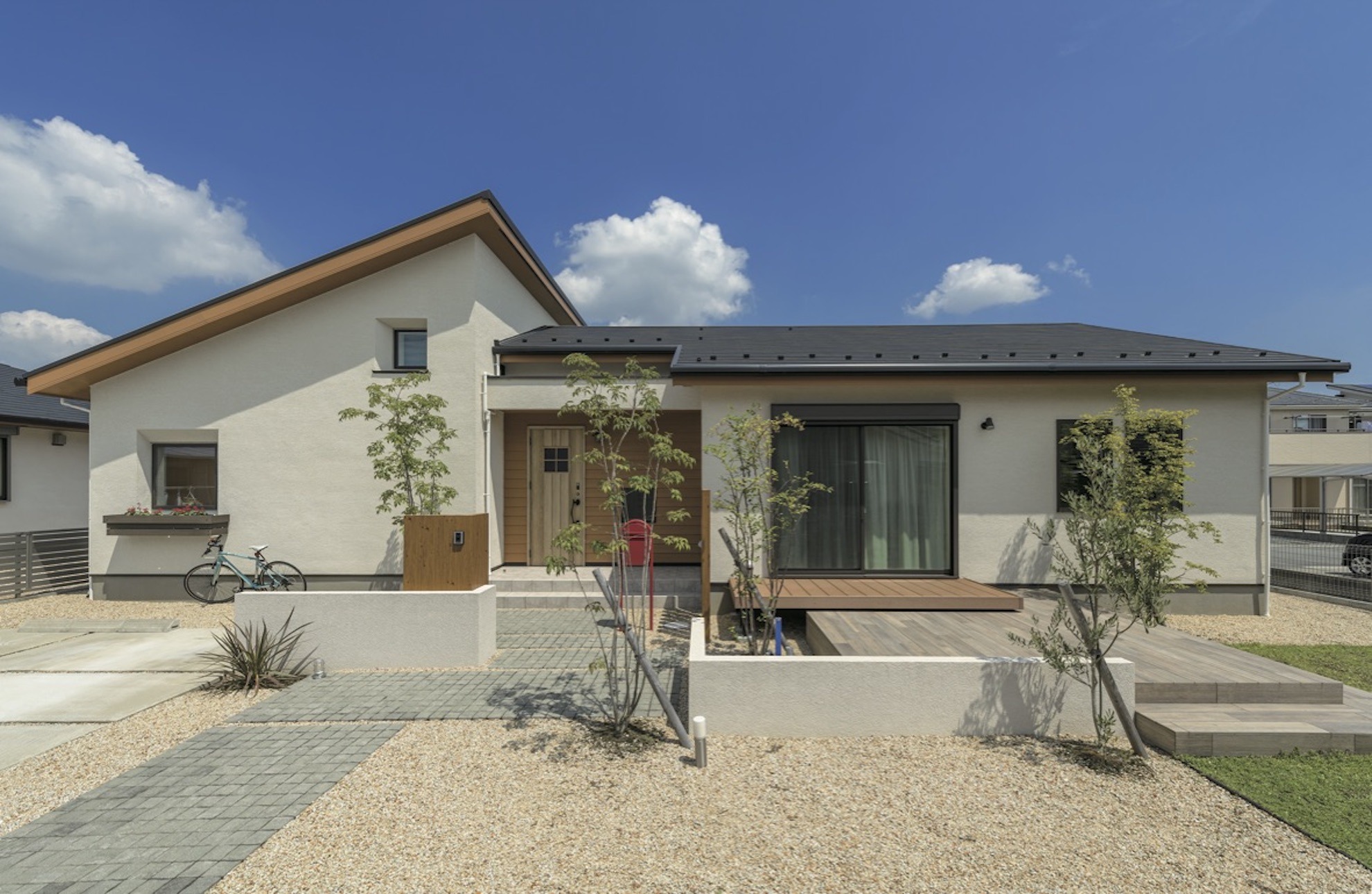 勾配天井の伸びやかな空間と家じゅうに広がる明るさ、庭と繋がる