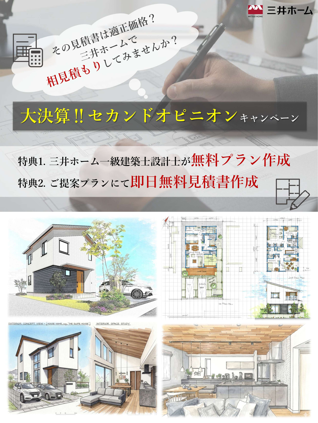 《流山おおたかの森モデルハウス限定》 ★大決算‼セカンドオピニオンキャンペーン★ 特典①三井ホーム一級建築士が無料プラン作成 →そのプラン、三井ホームがより良く生まれ変わらせます! 特典②ご提案プランにて即日見積書作成 →決算月、三井ホーム最大値引きで見積書をご用意します! 他のプランも見てみたい方や相見積もりをしたい方など、お気軽にご相談ください!お問合せお待ちしております! お問い合わせ・来場予約はこちら 見学予約|1回に3棟まで可能