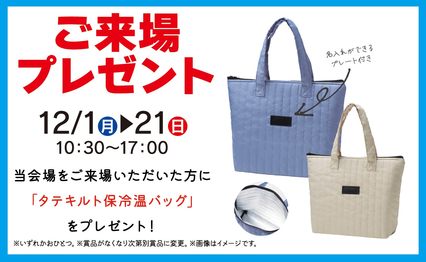 当会場をご来場いただいた方に「タテキルト保冷温バッグ」をプレゼント!