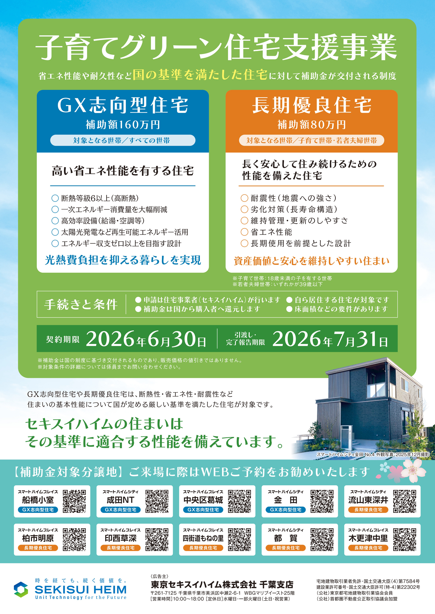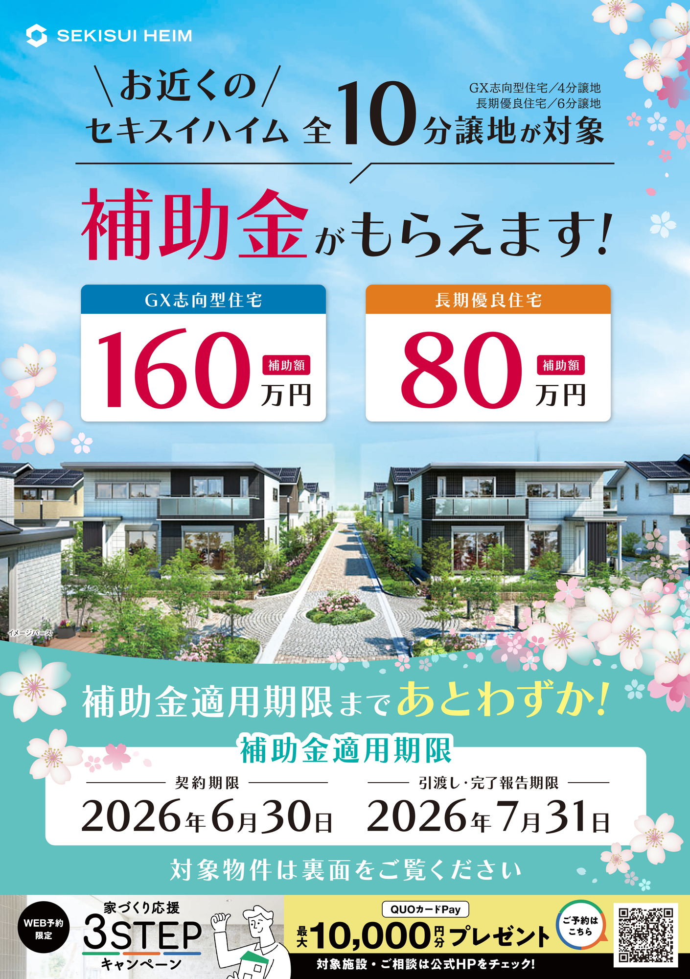 今がチャンス!全10分譲地が補助金対象となりました。理想のマイホームをお得に手に入れる絶好の機会です。 補助金詳細 ・GX志向型住宅:補助額160万円(4分譲地)・長期優良住宅:補助額80万円(6分譲地)補助金適用期間はあとわずか!この機会を逃さず、夢のマイホームを手に入れましょう。 補助金適用期限 契約期限:2026年6月30日引渡し・完了報告期限:2026年7月31日 詳細情報や見学のご予約は、今すぐお問い合わせください。お得に理想の住まいを手に入れるチャンスをお見逃しなく! ご予約はこちらから 分譲地詳細情報はこちらから 見学予約|1回に3棟まで可能