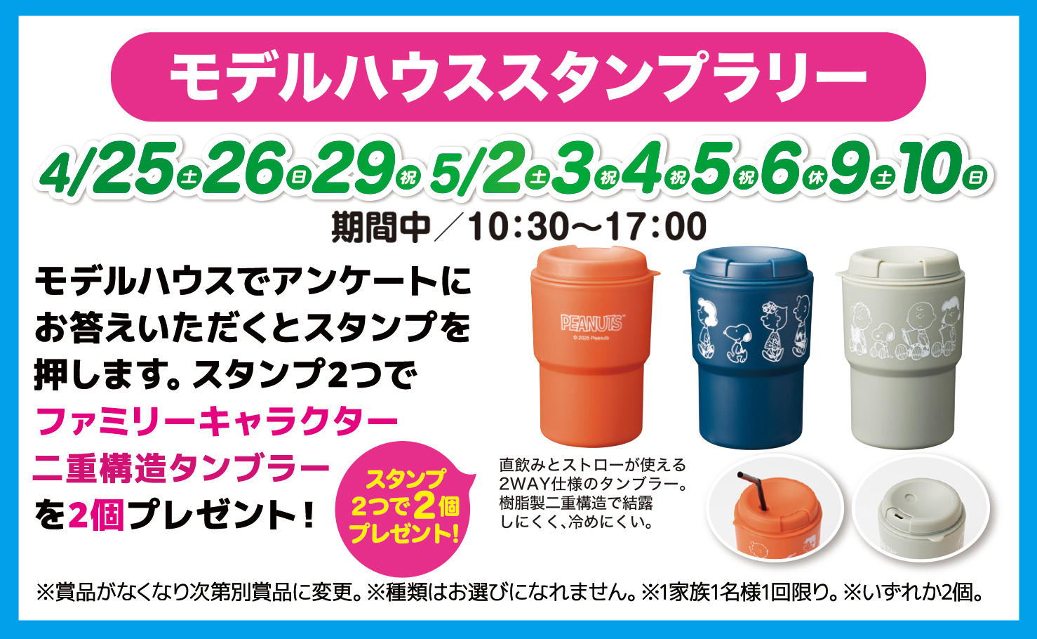 モデルハウスでアンケートにお答えいただくとスタンプを押します。スタンプ2つでファミリーキャラクター二重構造タンブラーを2個プレゼント!スタンプ2つで2個プレゼント! ●日程:4/25(土)・4/26(日)・4/29(祝)・5/2(土)・5/3(祝)・5/4(祝)・5/5(祝)・5/6(休)・5/9(土)・5/10(日)●時間:10:30~17:00 ※賞品がなくなり次第別賞品に変更。※種類はお選びになれません。※1家族1名様1回限り。※いずれか2個。 見学予約|1回に3棟まで可能